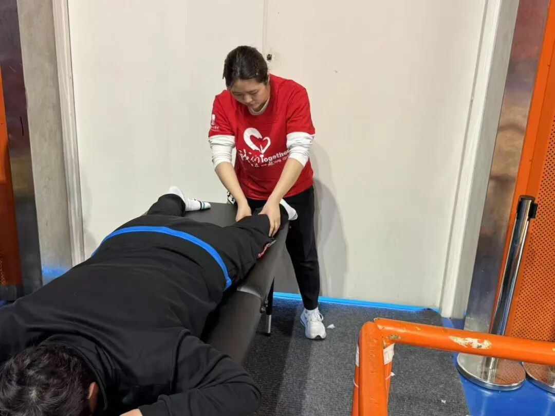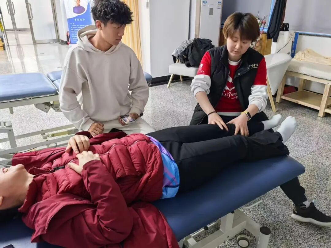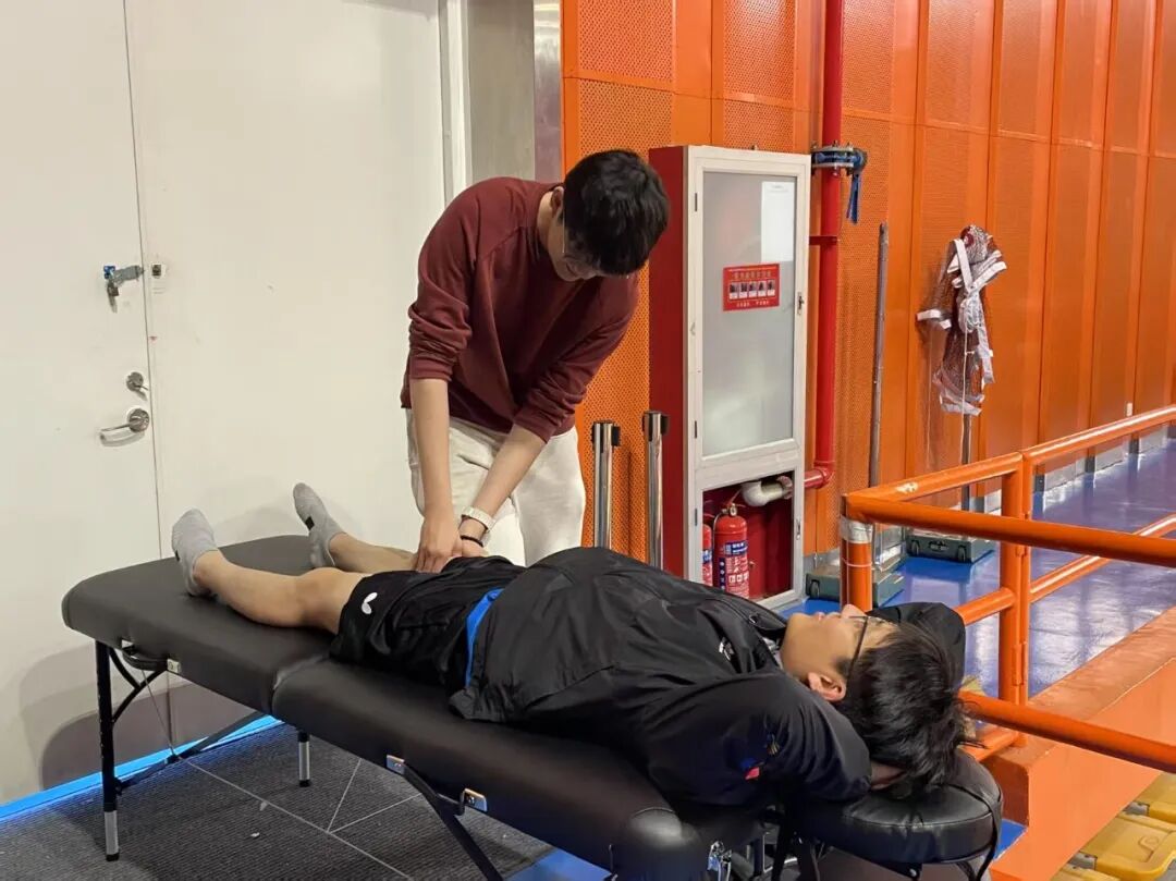 比赛期间,同学们充分发挥运动康复专业优势,为参赛运动员提供手法放松、动态牵伸、运动贴扎等针对性服务。针对高强度对抗中常见的肌肉拉伤、关节疲劳等问题,团队凭借“触诊评估—方案制定—即时干预”的标准化流程,迅速缓解运动员们的身体不适。