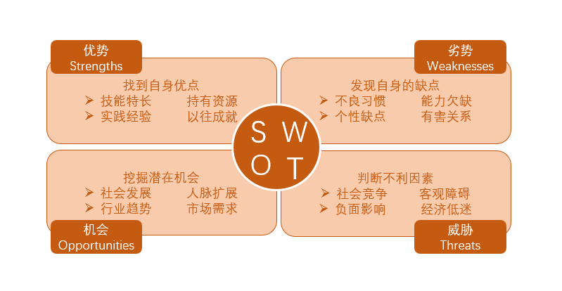 我通过SWOT分析进行自我评估,并通过行业调研、招聘简章、职场人访谈、自身经验来学习实践验证自己的分析假设。