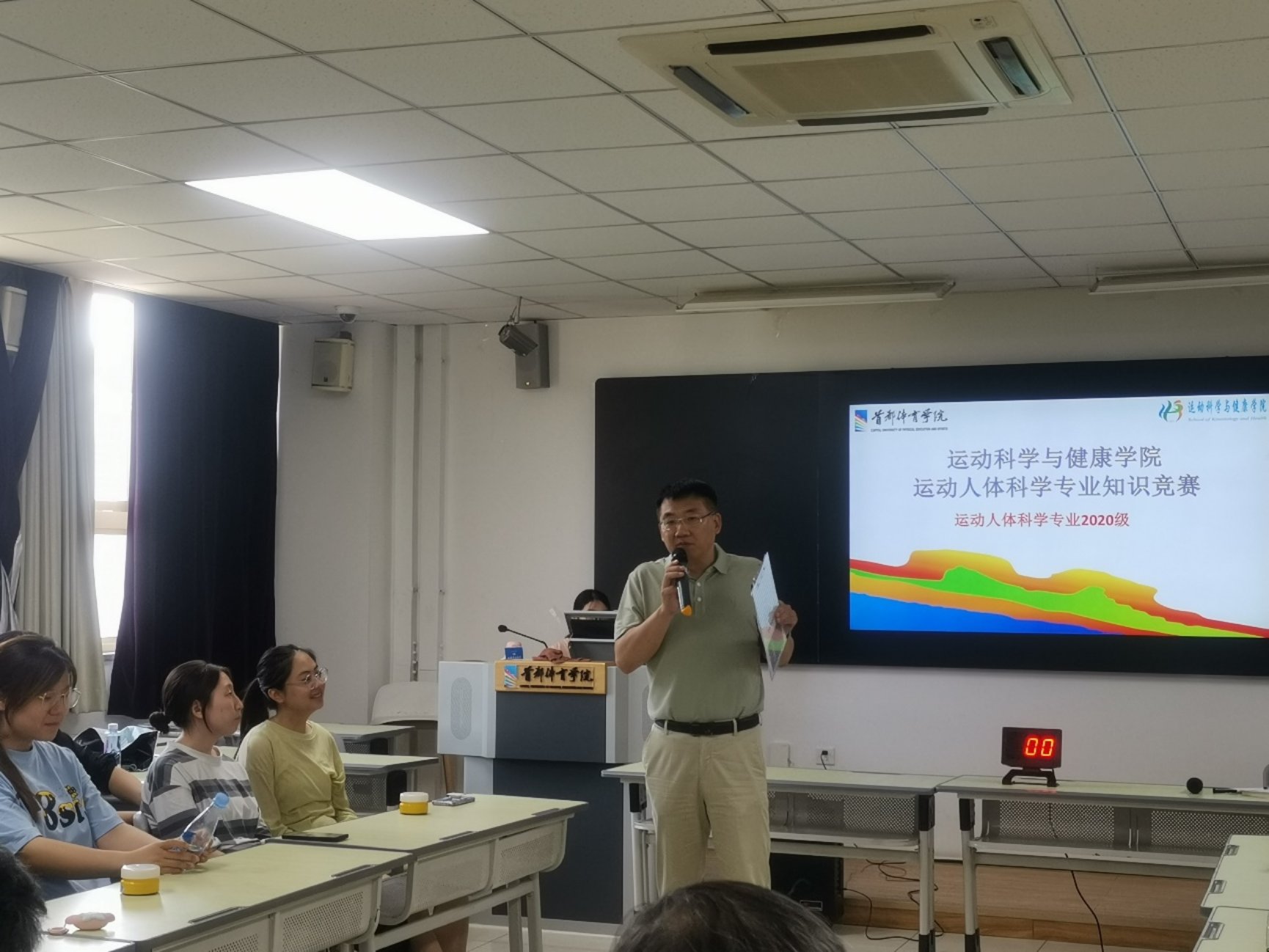 6月15日下午,朱古力av 于教学楼407教室组织召开运动人体科学专业2020级学生专业知识竞赛。竞赛邀请健康管理教研室季钢、王超、陈佑学三位老师担任评委,运动人体科学专业2020级全体学生参赛,运动人体科学专业2022级学生现场观摩,竞赛由杨少峰副院长主持。