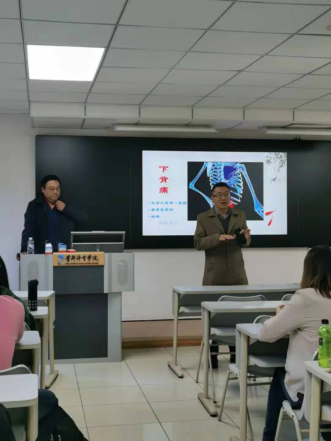 随后徐晖老师就下背痛概述、解剖与生物力学等内容开始了正式讲课,徐晖老师用风趣的语言为同学们深入浅出的解释了有关下背痛一系列问题,结合自身多年的临床经验,为同学们讲述了诸多病例,同学们受益匪浅。在讲座中徐晖老师还提出了“低功耗”的概念,同学们颇感兴趣。在学习中,徐晖老师还由下背痛的分型讲述了运动康复的治疗领域,即运动康复能治愈何种原因引发的下背痛的问题。由此引发出了其他关节的疾病是否属于运动康复领域的问题,使同学们明确了自己的能力范围。并根据不同原因的下背痛教授了不同的应对方法,让同学们对下背痛的理解有了进一步的认识,并了解了不同原因下背痛的改善方法。