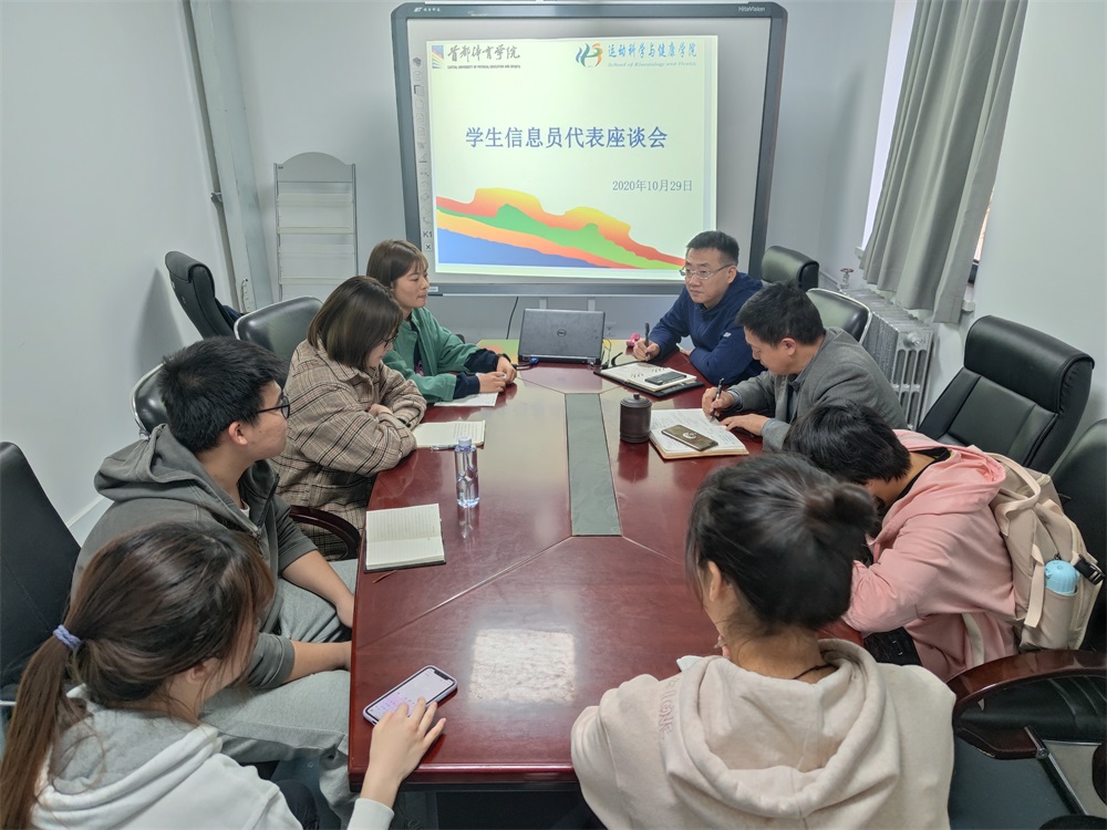2020年10月29日,运动科学与健康院学生信息员代表座谈会顺利召开。会议中,院长周军,副院长杨少峰,以及各位信息员代表就开学至今上课状况及学生表现等方面问题展开会议。
